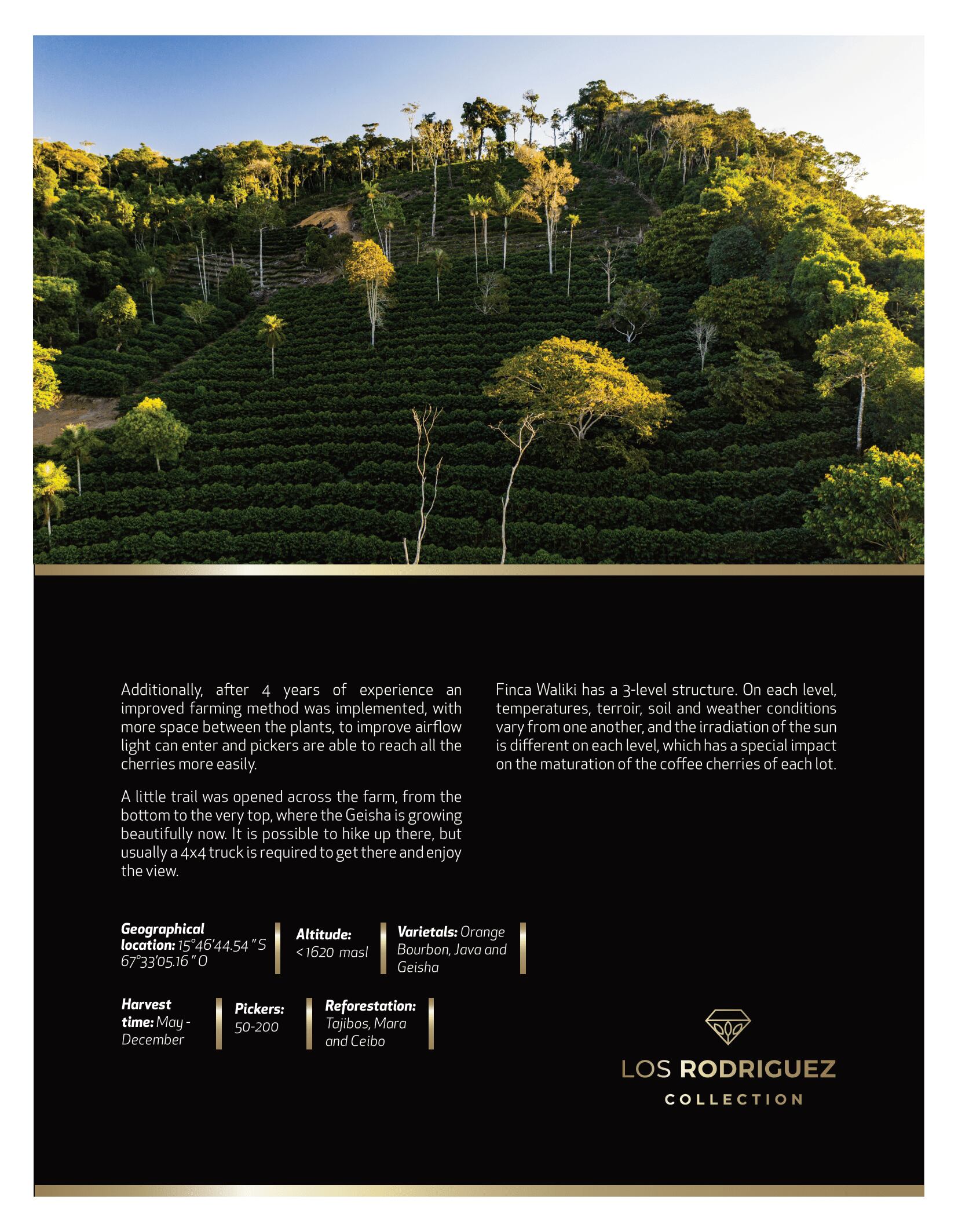 ロドリゲスファミリーの管理する土地、Los Rodriguez。Caranaviという町に位置しており、AlasitasやArcangelなどの土地から成されています。これらの土地ではコーヒーの生産だけでなく、世界中の60種類以上の品種を栽培し、この地域の気候条件のもとでどの品種が最もよく育つかということを試しています。(多くの品種を管理するため、生産者は農場にあるレモンやマンダリンの木を使ってロットを分けし、できた果実は地元の市場に販売しているそうです。)土地は30%以上の自然が保たれており、もとからある柑橘類やパパイヤ、アボカドの木をシェードツリーとしてコーヒーの栽培に活用しています。